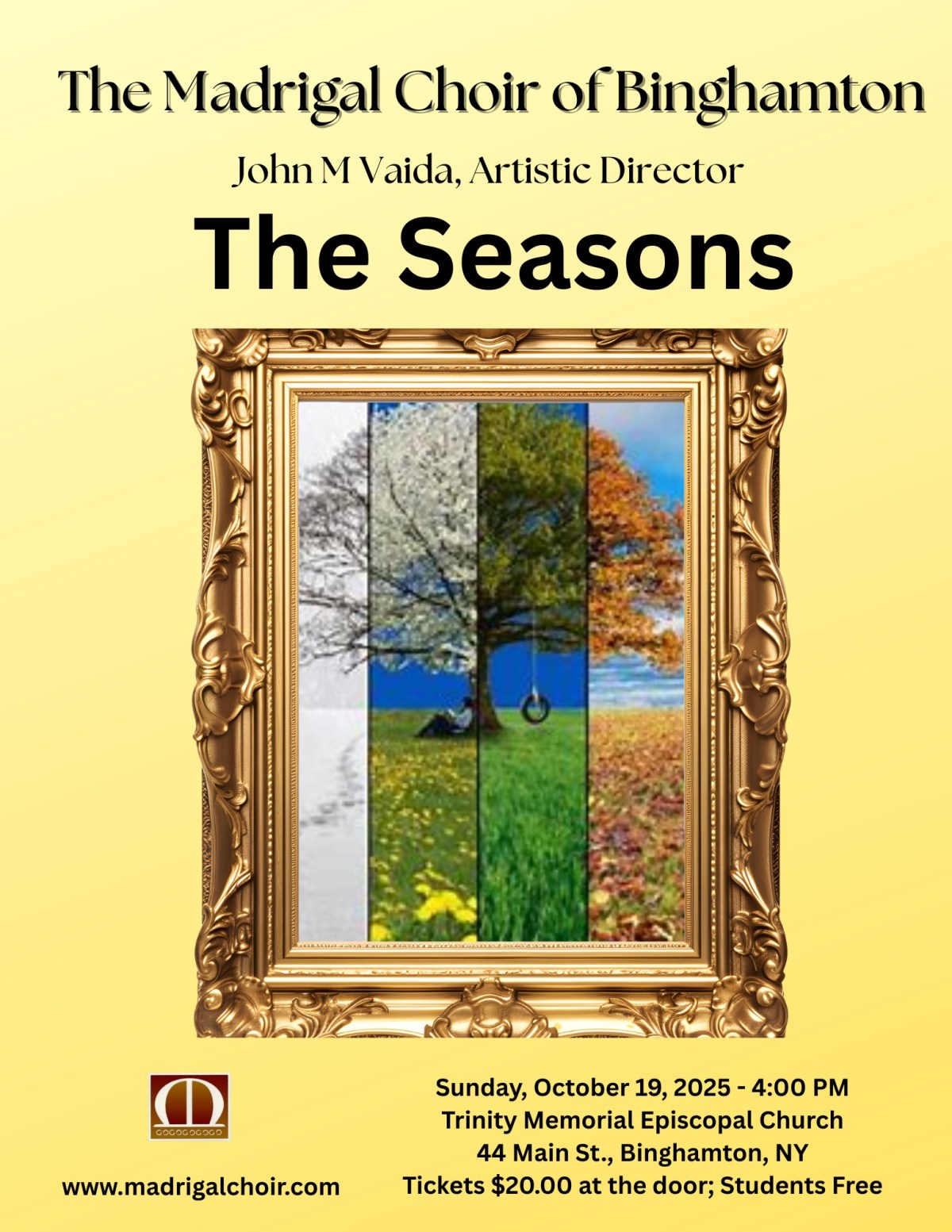 Binghamton NY area folks are cordially invited to celebrate all times of year with the Madrigal Choir of Binghamton’s concert “The Seasons” on Sunday, October 19, 2025 at 4 PM at Trinity Memorial Episcopal Church, 44 Main St., Binghamton.