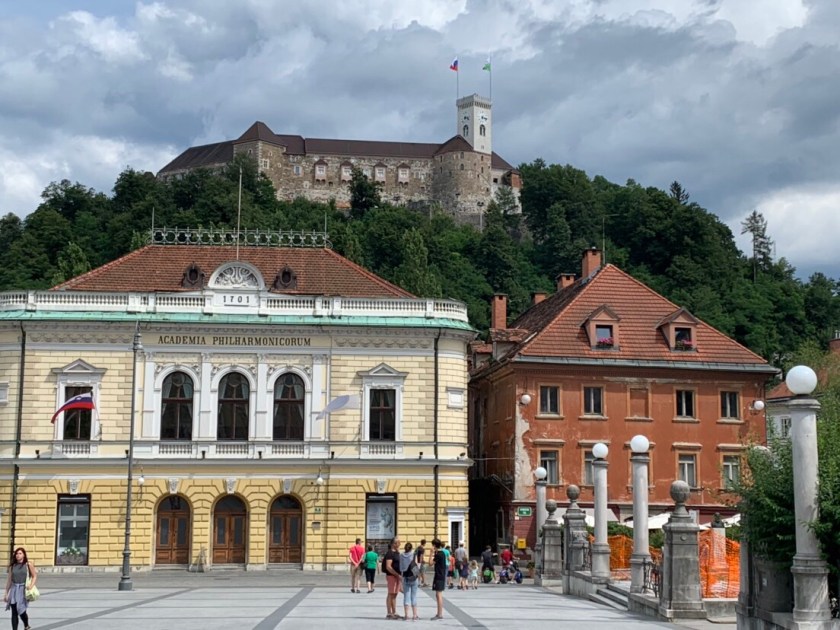 The statue depicts the Muse holding a laurel branch of over Prešeren, but, given that the Muse is mostly unclothed, the monument was controversial, especially as the Square is bordered by the Franciscan Church of the Annunciation, also known as the “pink church.” I was able to attend Sunday Mass there on our last morning in Ljubljana. (This photo was taken from across the river; the square itself was partially closed off due to reconstruction of the pavers.)
