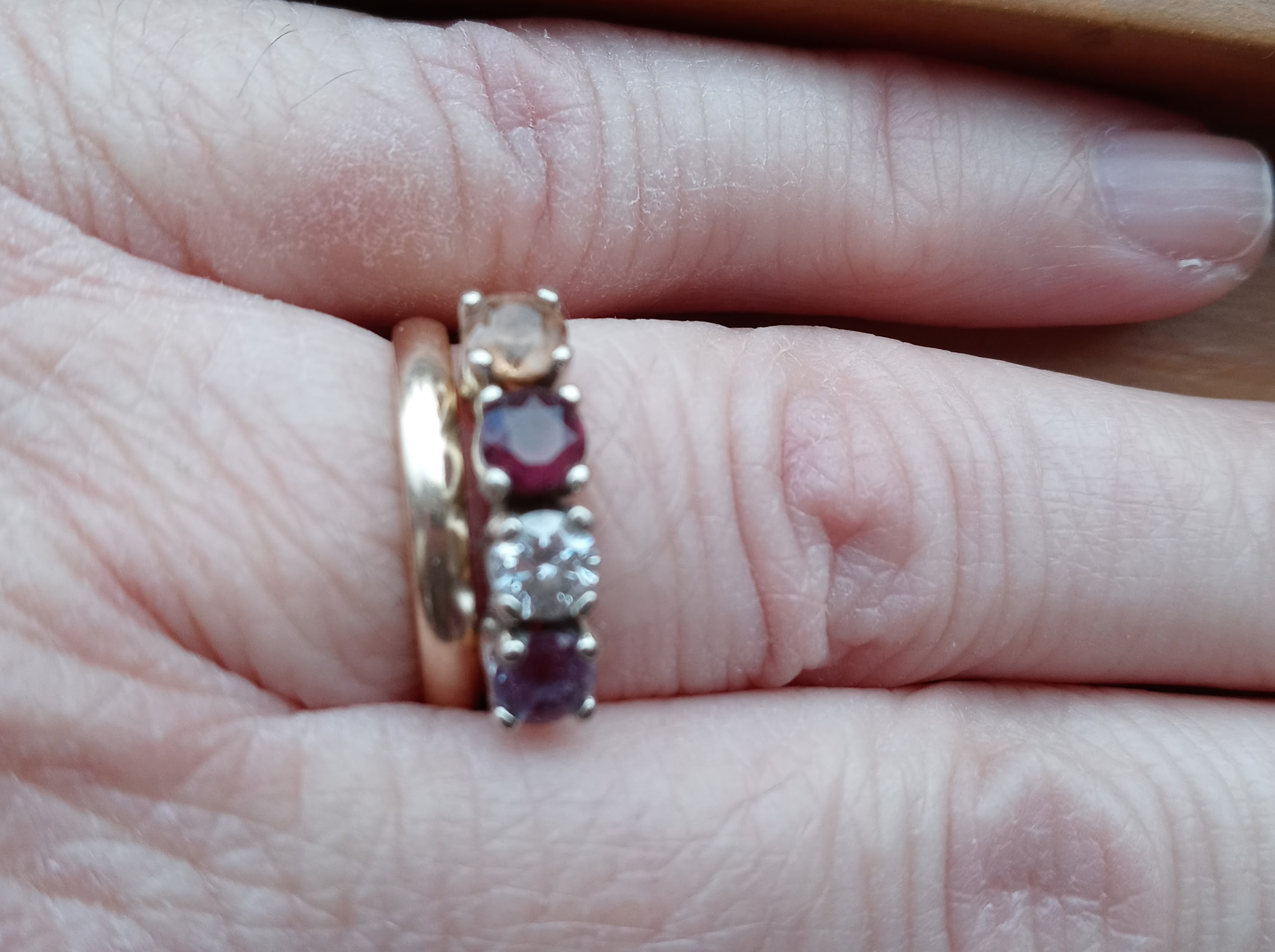 Ten-ish years ago, I decided to make a change. I brought my rings to a local jeweler with an idea. They removed the diamond from its setting and used some of the gold to re-size my wedding band while preserving the original engraving inside. The diamond was re-set into what I call a family ring. The diamond represents the April birthday of daughter E. There is a November topaz for B, a pink zircon for me (October), and alexandrite for daughter T’s June birthday. The alexandrite is especially interesting because it looks purple when I’m indoors but a blue-green in sunlight.