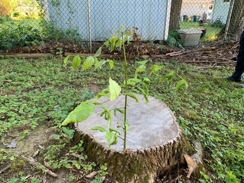 It’s growing very quickly. It certainly has a very large root structure, given that it is growing directly from where the bark meets the wood of the stump. Given its position, we aren’t sure it will survive long-term, but it is nice to see nature trying to come back from a plague.