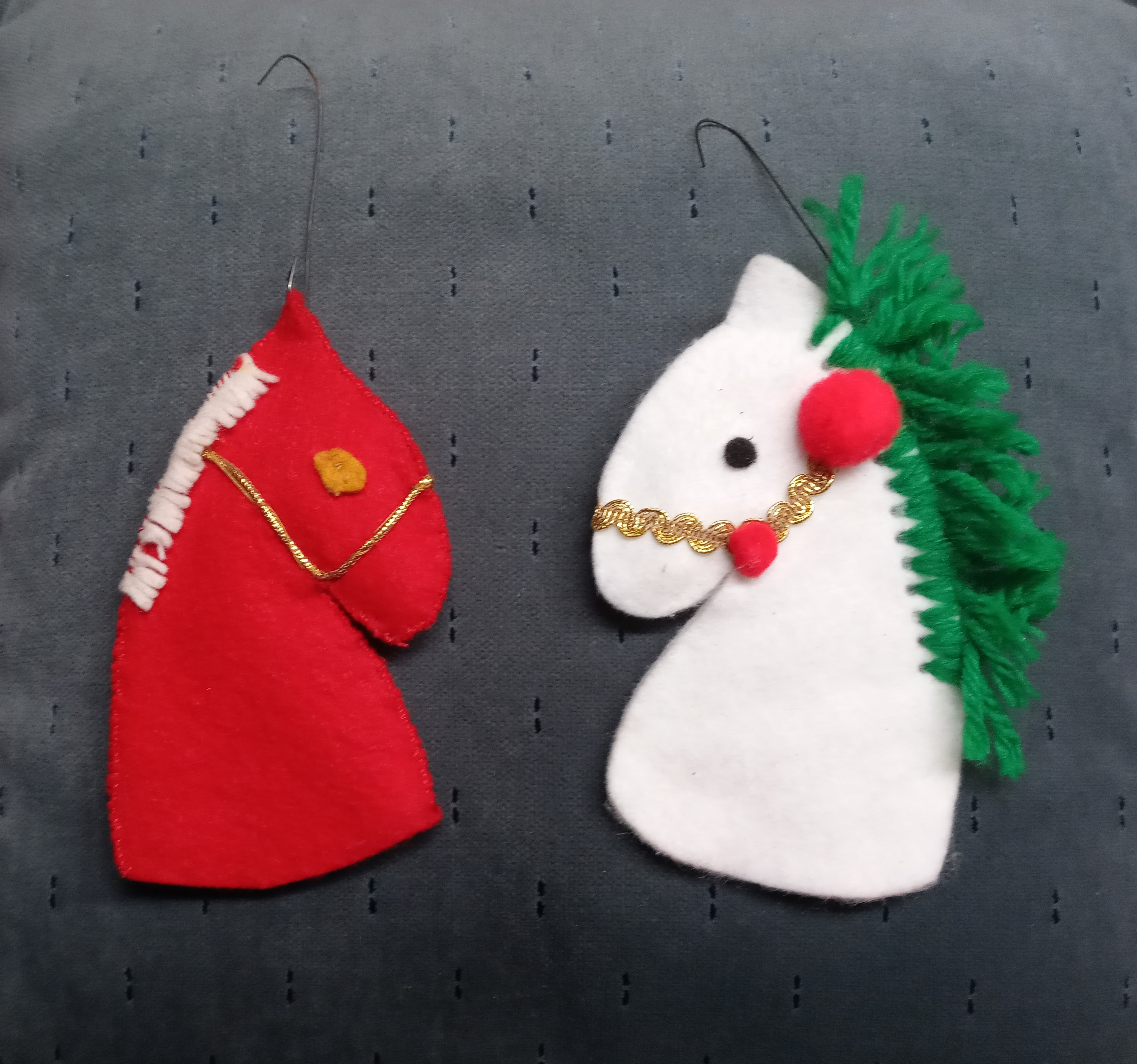 These ornaments double as candy cane holders, so that they look like hobby horses when they hang on the tree. The red one was made over fifty years ago by my spouse B when he was in elementary school. The white one was made about thirty years ago by B’s mom, when she was teaching in elementary school and would lead her students in creating a holiday gift for their parents. She would always make extras to give to family members. I’m sure hers were prettier than her students, although all are equally treasured.