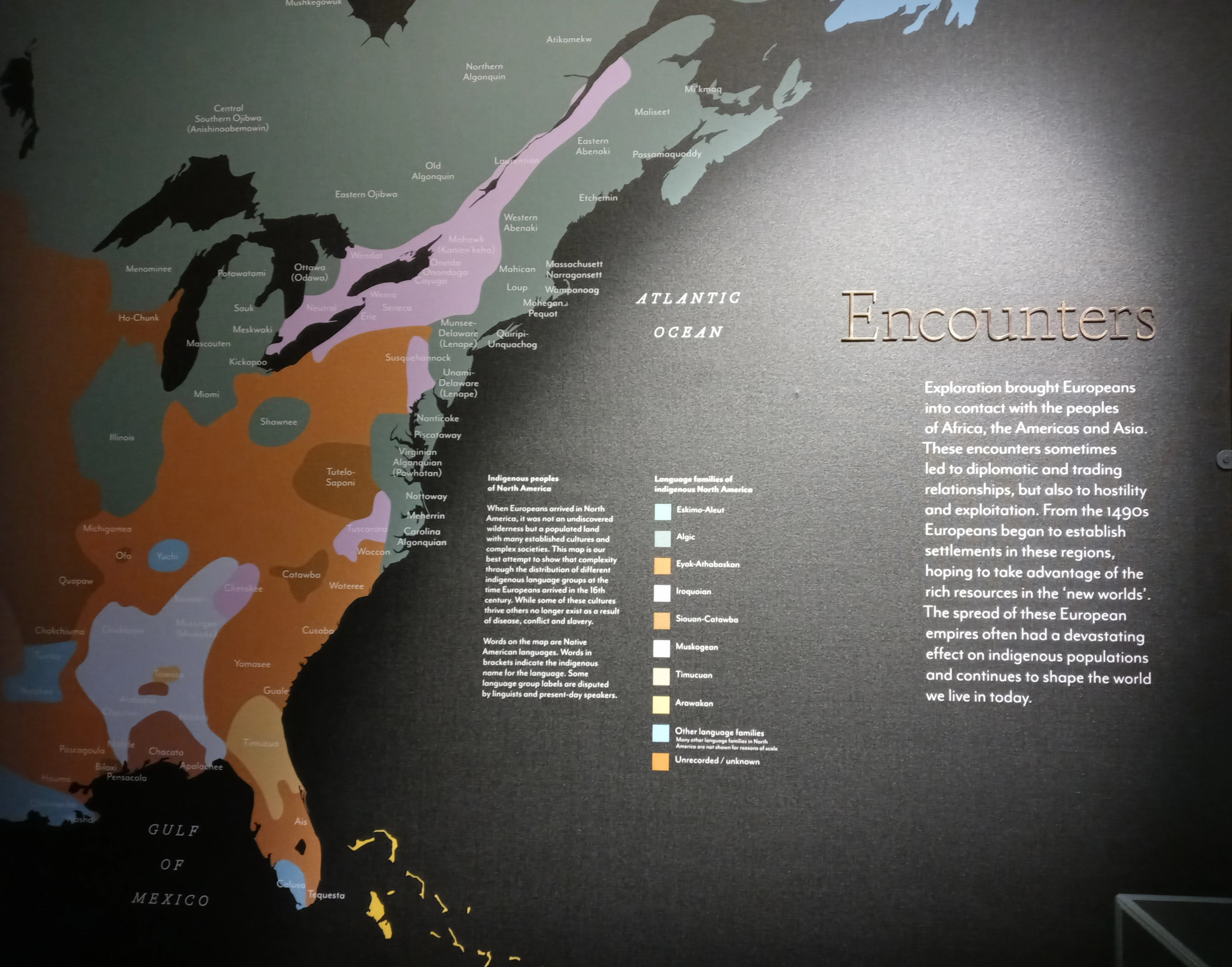 After lunch in a nearby pub, we went to the National Maritime Museum. I was interested to see how some of the exhibits were bringing in indigenous perspectives, such as this map showing language groups from the colonial period in the current US and Canada.