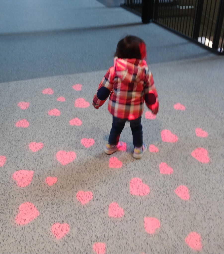 At the moment, there are a number of light installations scattered around the complex. JG was especially taken with these hearts and kept hopping from one to another, while saying “another heart” over and over in an enthusiastic, two-year-old voice. I suppose it’s possible that this was more of a valentine feature than part of the light installations, but it was fun, none the less.